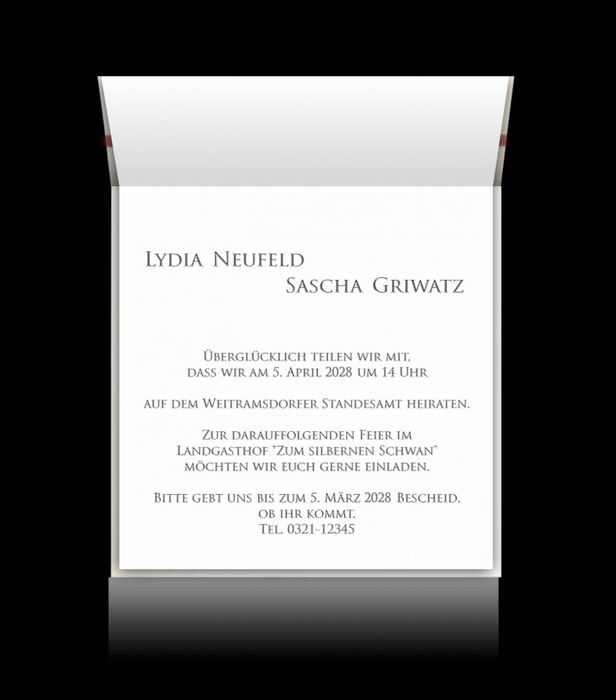 Wir haben unsere Einladungskarten erhalten. Sie sind viel schöner als auf der Internetseite. Es ging viel schneller als gedacht und wir sind überglücklich darüber.