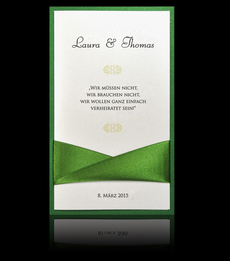 Aufklappbare Hochzeitskarte. Der graue Text ist auf das weiße Perlmuttpapier gedruckt. Das Ganze ergänzen ein dunkelgrünes Papier und der Ausschnitt durch den der dunkelbraune Satinband hindurchgezogen ist. Unter den Band ist das weiße bedruckte Papier gesteckt. Standarddruckfarbe ist S12 – grau (Digitaldruck) + ein Ornament (unter den Namen, hellgrün gedruckt-Digitaldruck)